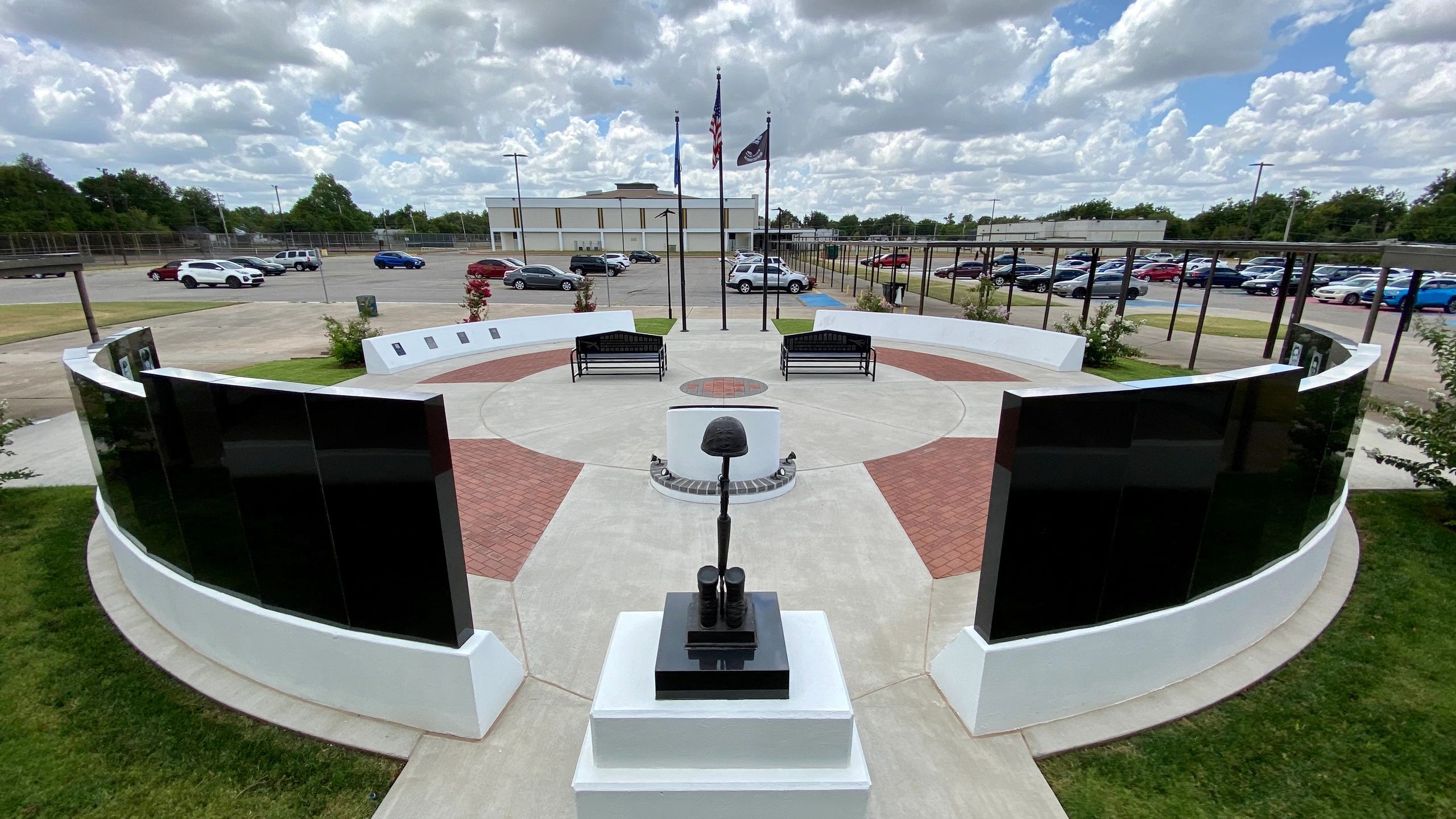 BOMBER PLAZA: Opposite the Wall of Honor in the encompassing circular plaza is the four-foot high concrete Honor Roll Wall. It holds space for 16 special recognition plaques for honorees of future military or civilian events, at the school’s discretion. At the time of the dedication, picture-plaques saluted the former MCHS student killed in action in Iraq in 2006, and the three former Midwest City students killed in the Oklahoma City Murrah Building bombing of 1995. At the base of the Honor Roll Wall are inscripted bricks placed by alumni and friends of Midwest City High School.